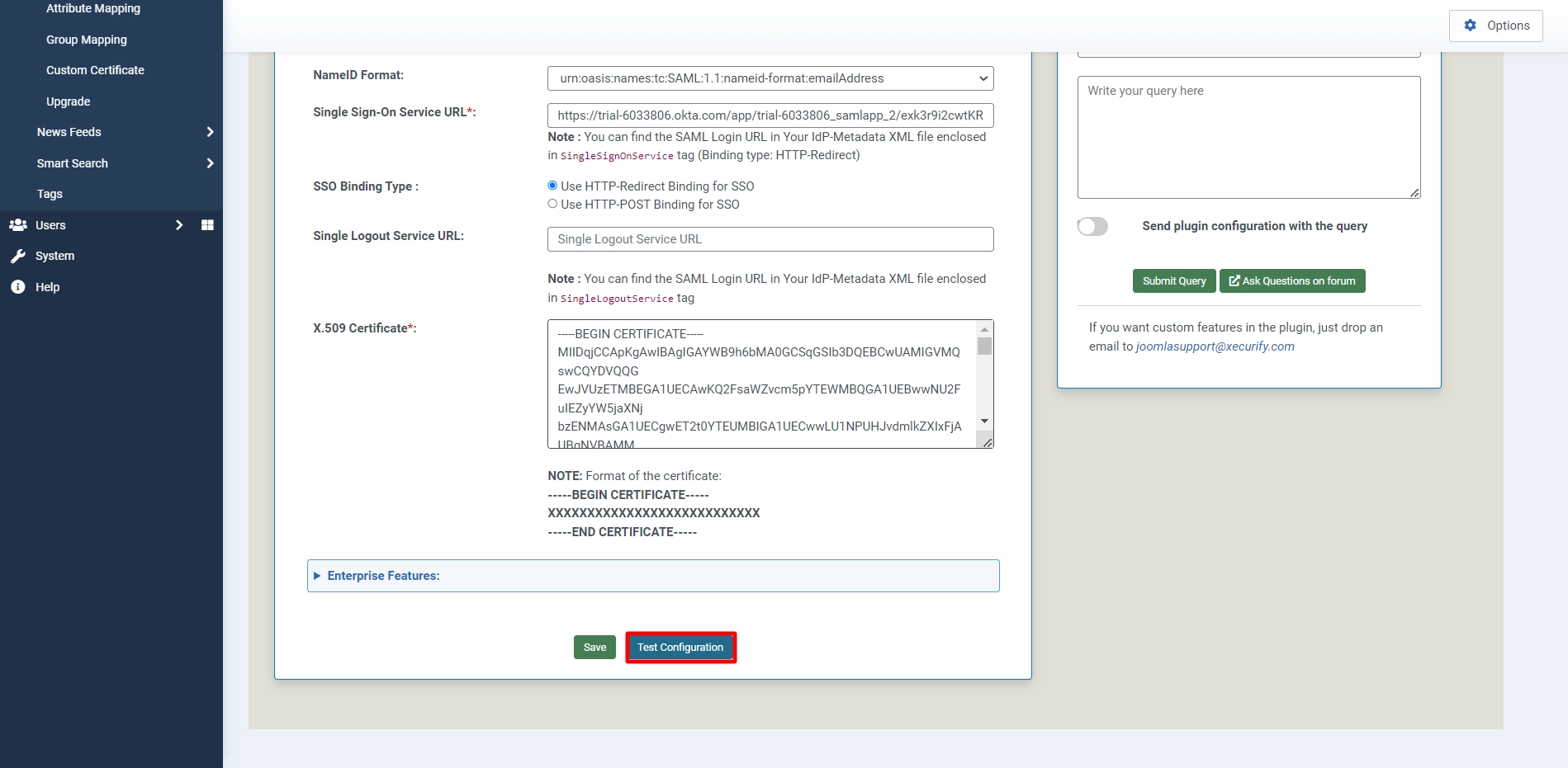 • In case, you are facing some issue or have any question in mind, you can reach out to us by sending us your query through the Support button in the plugin or by sending us a mail at joomlasupport@xecurify.com.